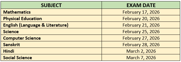 The official CBSE Class 10 board exams will begin on February 17, 2026 and end on March 10, 2026. Below is the list of important subjects and their respective exam dates: